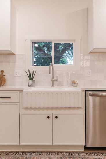 And the kitchen? A team favorite — especially thanks to a happy accident. We originally planned to install a flat-front farmhouse sink, but due to a last-minute availability issue, our project manager sourced a scalloped-edge version instead. It ended up being one of the most complimented features in the entire home. Just one of those “this was meant to be” design moments.